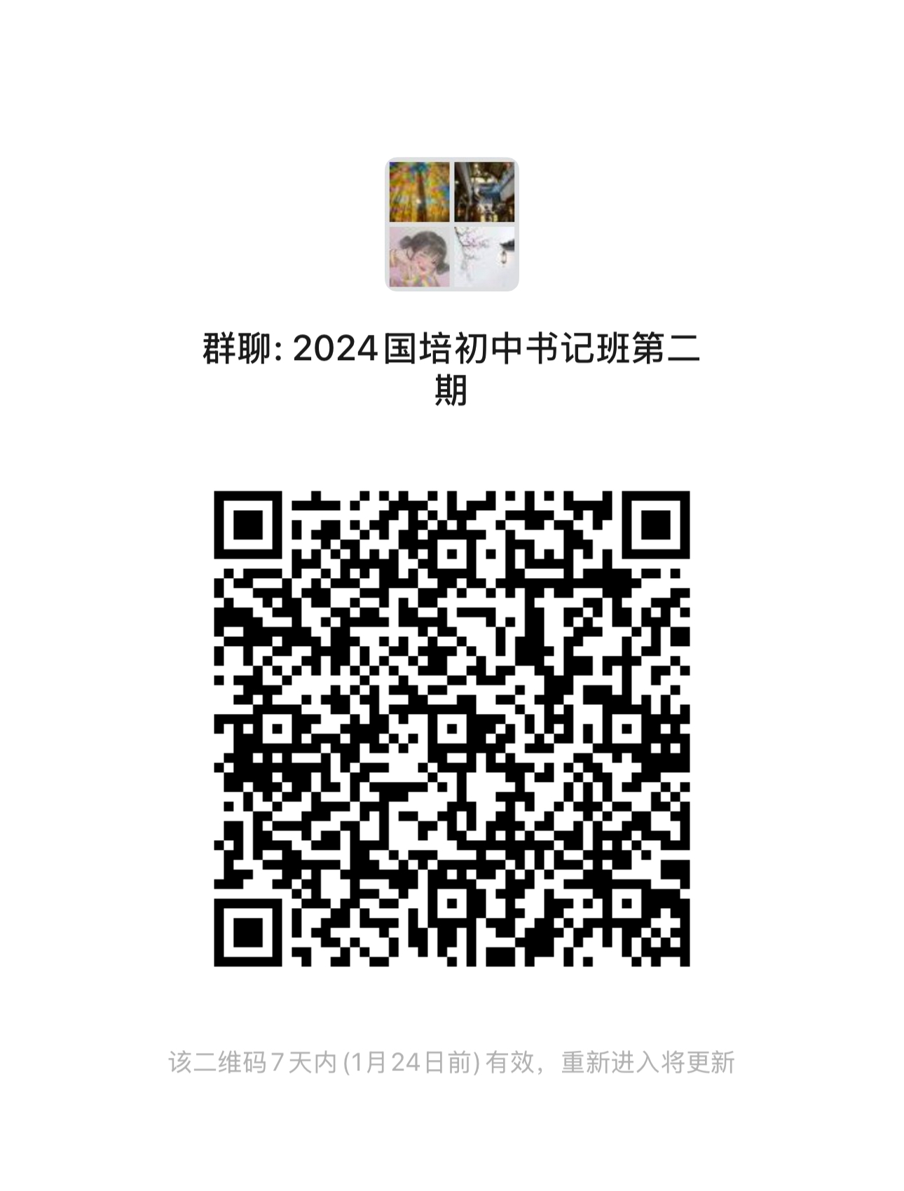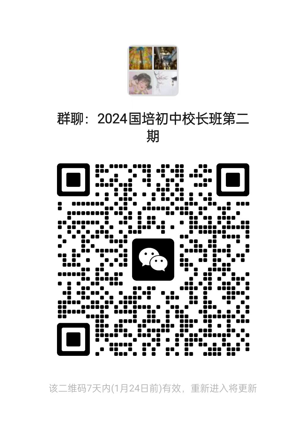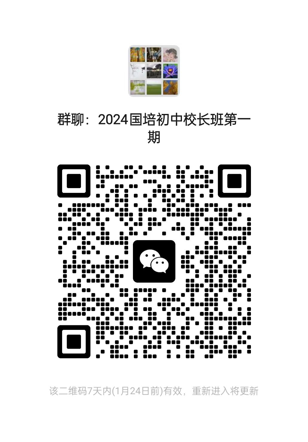 各位初中校长、书记: 您好,2024国培工作暂定于2025年3-4月份开展,为了方便沟通,我们建立了四个微信工作群(群码附后),请您按照分组于2025年1月24日之前加入相应的微信工作群,国培工作相关通知会在群里发布,分组名单详见附件1、2、3、4。感谢您的配合。 附件1:2024国培初中校长班第一期学员名单附件2:2024国培初中校长班第二期学员名单附件3:2024国培初中书记班第一期学员名单附件4:2024国培初中书记班第二期学员名单 石家庄学院继续教育学院 2025年1月17日 |