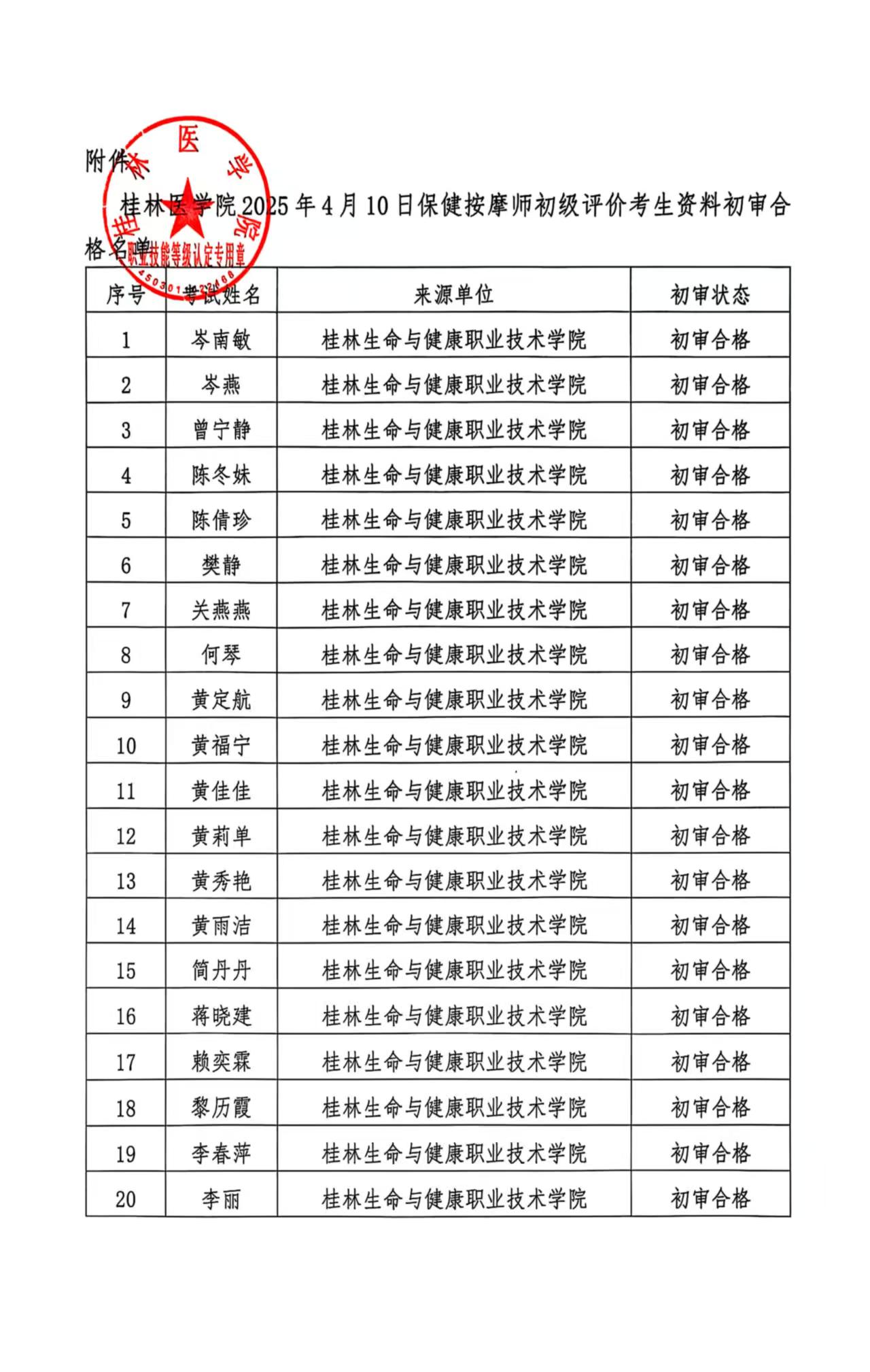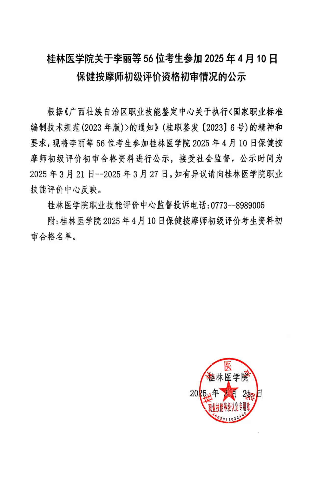 桂林医学院关于李丽等56位考生参加2025年4月10日保健按摩师初级评价资格初审情况的公示