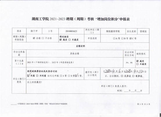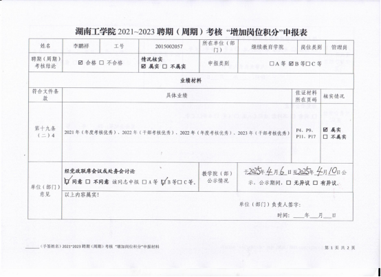 根据《湖南工学院招聘考核管理办法》(湘工发〔2023〕38号)及学校《关于申请“增加岗位积分”的通知》要求,经个人申请、资格审查及继续教育学院院务会审议,现将我院2025年度“增加岗位积分”申报人员及相关材料予以公示,具体事项通知如下: 一、公示内容 1. 申报人员信息: 姓名:阳兰平 岗位:继续教育学院成人教育科科长(管理岗),申报类别:C等; 姓名:李鹏祥 岗位:继续教育学院综合办公室主任(管理岗),申报类别:B等。 2. 公示材料: “增加岗位积分”申报表(阳兰平) “增加岗位积分”申报表(李鹏祥) 二、公示时间 2025年4月6日—4月10日(共5个工作日)。 三、意见反馈 公示期间,如对申报人员资格、材料真实性等有异议,请以书面形式实名向学院办公室反映,并提供具体依据及联系方式。 联系电话:0734-8432328 办公地址:社科楼401东 五、其他说明 1. 申报材料仅作公示用途,未经允许不得转载或他用; 2. 公示期满后,学院将按程序报送学校人事分配制度改革工作领导小组审议。 继续教育学院 2025年4月6日 |