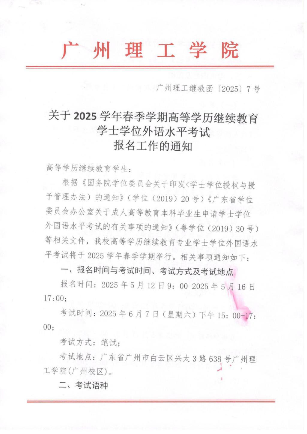 关于2025学年春季学期高等学历继续教育学士学位外语水平考试报名工作的通知