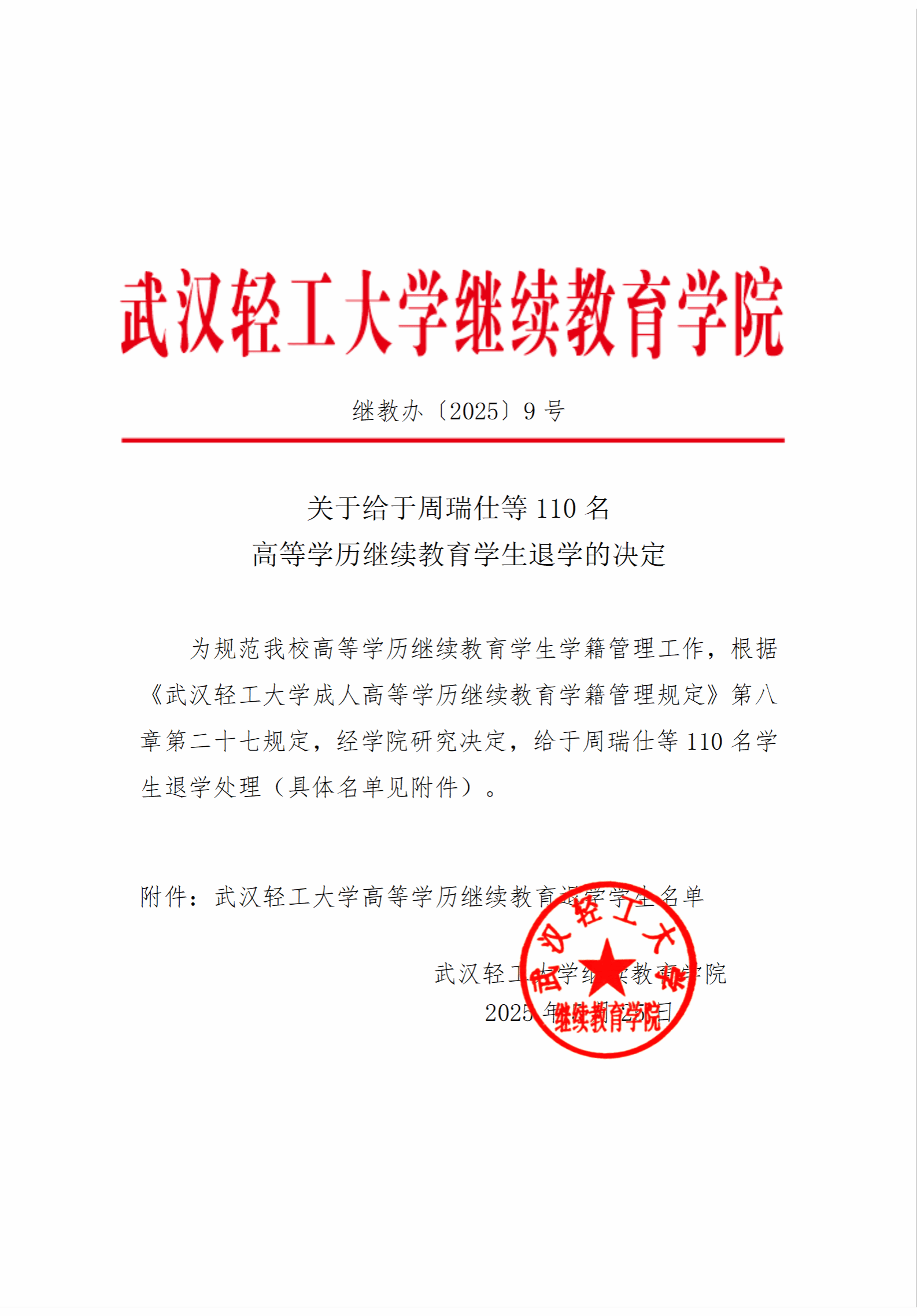 关于给于周瑞仕等110名高等学历继续教育学生退学的决定