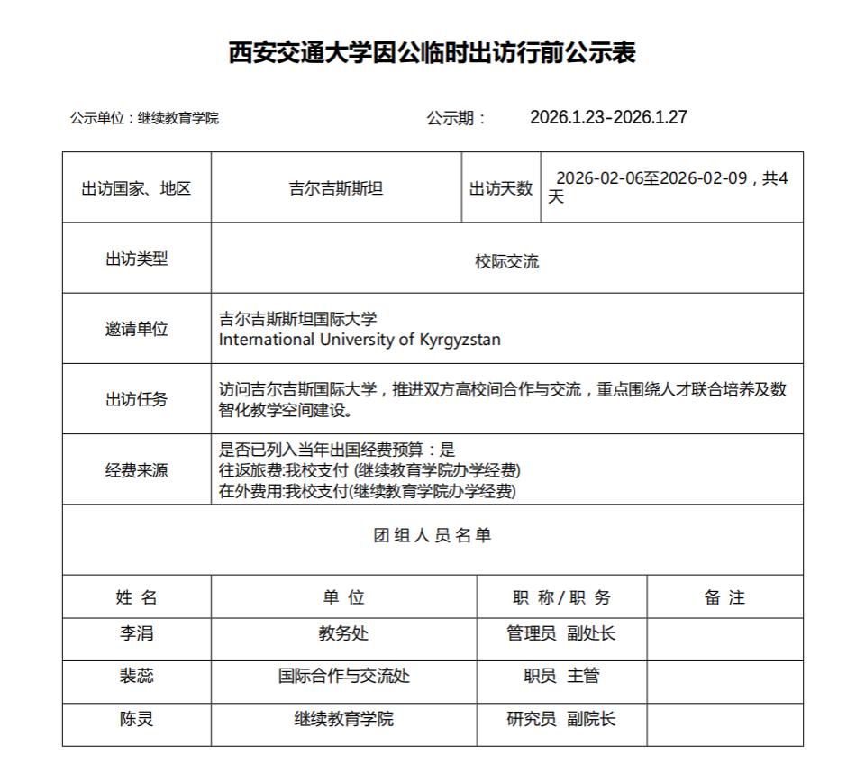 陈灵因公临时出访吉尔吉斯斯坦行前公示