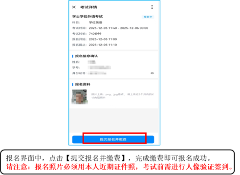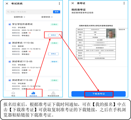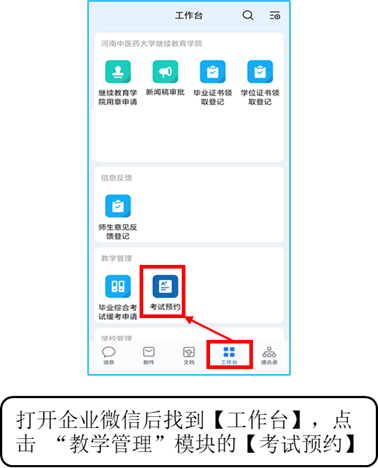 3报名流程 首先注册个人信息,填写及校对报考信息,上传本人电子照片(近期免冠证件照、免修图),也可在报名界面拍照上传照片。报考信息提交后缴费,等待学校审核通过后,即为报名成功(继续教育学院考试报名流程https://www.kdocs.cn/l/clEcgfoIesKL)。审核不通过者,报名无效,报名费原路退还。 (1)登录企业微信,从工作台找到考试预约模块。 ![]() (2)选择“2026年学位外语考试”。 ![]() (3)缴费:进入报名界面后即可进行考试缴费(如有学费欠费,请在学费缴纳完成60分钟后,再进行报名)。 ![]() (4)准考证下载(2026年4月6日-11日)。 ![]() (5)考试当天签到方式。 ![]() 4报名时间 (1)第一阶段:2026年3月26日9:00-3月27日17:30 (2)第二阶段:2026年3月30日9:00-3月31日17:30 报名时间为:每天9:00-17:30,其余时间为系统维护和审核时间。 三、报名费标准及缴纳方式 按照《河南省发展和改革委员会河南省财政厅关于确定我省成人高等教育本科毕业生申请学士学位进行外语水平考试报名考务费收费标准的函》(豫发改收费函〔2004〕577号)的规定,报名考试费标准为每生每次70元。采用网上扫码支付,不支持现金支付;缴费成功后,学校将进行资格审核。审核通过者视为报名成功;审核不通过者,报名无效,报名费原路退还。 四、考试大纲 高等教育出版社出版《成人高等教育本科生学士学位英语水平考试大纲(非英语专业)》(2016年12月第二版)。 五、其他要求 1.考生应在规定的时间内完成网上报名和网上缴费,逾期不予办理。不符合报名条件者报名无效; 2.准考证打印时间:2026年4月6日-4月11日; 3.参加河南中医药大学高等学历继续教育学士学位外语考试的所有考生(包括现役军人和人民武装警察)使用的有效证件为第二代居民身份证。考生应提前检查本人第二代居民身份证是否丢失、消磁,并确保在有效期限内,以免影响报名考试。 4.我校不举办学位外语考试考前辅导班,不出售相关教材或辅导材料。请全体考生不要相信某些个人或机构承诺“包过”“不过退款”等虚假宣传,避免上当受骗。 5.考试纪律:提供虚假信息或在考试中出现违纪行为的考生,一经查出,本次考试成绩无效,责任由考生本人承担。 6.请各位考生及时关注河南中医药大学继续教育学院官方网站(https://jxjyxy.hactcm.edu.cn/)及微信公众号的相关内容。未尽事宜,以河南中医药大学继续教育学院官网发布的正式通知为准。 六、成绩查询 预计5月上旬。 七、学位外语报名系统技术服务热线 1.咨询时间:工作日上午:8:30-12:00;下午:14:30-17:30 2.咨询电话:继续教育学院教学与网络教育办公室0371-65955129(如电话因咨询人数众多无法接通时,请联系本人所属校教学站点,由校教学站点汇总问题后联系学院教学与网络教育办公室)。 3. 学位外语报名系统技术服务问题【收集表】河南中医药大学继续教育学院考试报名系统问题收集表https://doc.weixin.qq.com/forms/ALUAKQdtAAcAYEAigaGAEUCNAqgJJoHOf ![]() 河南中医药大学继续教育学院 2026年3月24日 |
