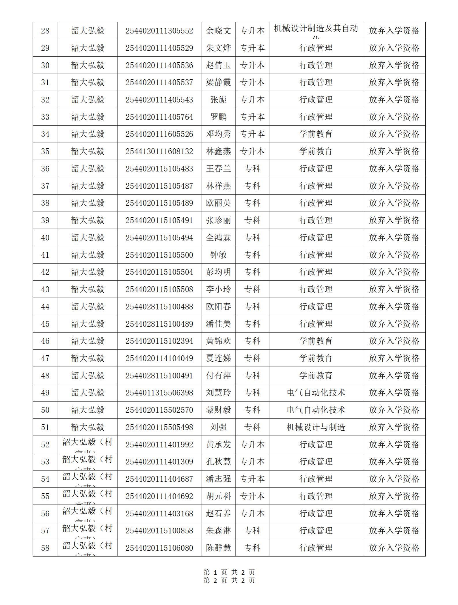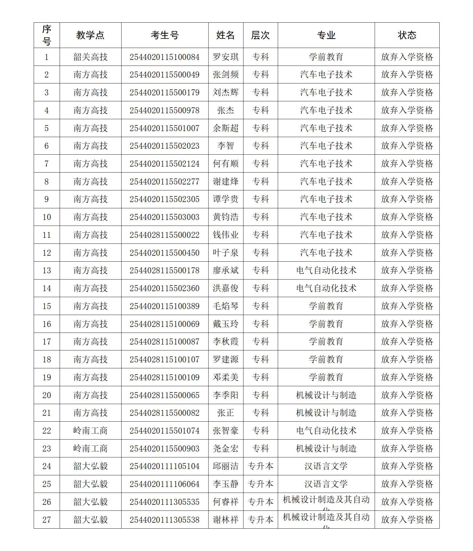 各二级学院、教学点、2026级新生: 根据《普通高等学校学生管理规定》(教育部令第41号)和《广东省成人高等教育学生学籍管理规定》(粤高教成〔1995〕43号)、《韶关学院高等学历继续教育学生管理规定》(韶院继教〔2024〕5号)以及《关于做好2026级高等学历继续教育新生报到及学籍注册的通知》《韶关学院高等学历继续教育新生报到及学籍注册的补充说明》等文件要求,未按时缴费报到的新生视为放弃入学资格。截止至2026年3月24日,尚有罗安琪等58名新生未办理报到手续,现将名单予以公示。 公示结束后将在中国高等教育学生信息网进行放弃入学资格标注,如有异议,请在公示期内与继续教育学院学历教育管理科联系。 公示时间:2026年3月25日至3月31日 联系电话:0751-8617565、0751-8614242 附件:2026级新生放弃入学资格学生名单 韶关学院继续教育学院 2026年3月25日 ![]() ![]() |