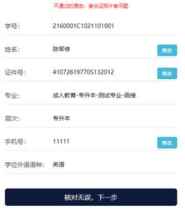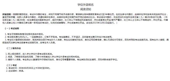 根据《河南省学位委员会办公室关于做好授予高等学历继续教育本科毕业生学士学位有关工作的通知》(豫学位办〔2021〕3号)及《河南工程学院高等学历继续教育本科毕业生学士学位外语考试考核及成绩认定办法》(河工院继教〔2021〕204 号),结合学校实际,现将2023年我校成人学位外语考试有关事宜安排如下: 一、考试方式及考试时间 本次考试采用远程在线考试方式进行,为帮助考生熟悉操作流程及考试设备调试,考前特安排模拟考试。 模拟考试时间:2023年2月11日(星期六)上午9:00至11:00。 正式考试时间:2023年2月12日(星期日)上午9:00至11:00。 二、考试语种 本次考试语种为英语,不考听力,考试大纲采用高等教育出版社出版的《成人高等教育本科生学士学位英语水平考试大纲(非英语专业)》(2016年12月第二版)。 三、报考对象 河南工程学院高等学历继续教育在读本科生。 四、报名程序及要求 1.考生于2023年1月1日至5日登录考试报名系统(网址:http://crjy.wencaischool.net/hngc),在主页点击“学位外语报名”,登录个人账号、填写报考信息、上传本人近期免冠电子照片及身份证正反面照片(电子照片标准见报名系统提示)。 2.提交报名信息24小时内,学校对考生的信息及上传的照片进行审核,未经审核或审核不通过的考生不能进行网上缴费。 3.审核通过的考生于2023年1月6日至8日在线缴纳报名考试费,1月8日18点截止。按照《河南省发展和改革委员会 河南省财政厅关于确定我省成人高等教育本科毕业生申请学士学位进行外国语水平考试报名考务费收费标准的函》(豫发改收费函〔2004〕577号)的规定,报名考试费标准为每人70元,通过“河南工程学院财务处”微信公众号“学生收费”--“学生缴费”缴纳考试费用,缴费成功才能参加考试。一旦缴费成功,订单不予取消。考生缴费后,不予退还,且所缴考试费只供当次考试使用。 4.考生于2023年2月6日-11日通过http://haue.jxjy.chaoxing.com/login自行下载打印准考证。考生须携带准考证和第二代居民身份证原件参加考试。远程在线考试的具体安排请随后关注河南工程学院继续教育学院网站(http://jxjy.haue.edu.cn/)。 五、成绩公布 2023年2月20日后可通过河南工程学院继续教育学院网站查询成绩。 六、考风考纪 考生在考试中出现违纪行为的,本次考试成绩无效,且三年内不准其参加该项考试。对提供虚假信息或资格不符的考生,一经查出,其本次考试成绩无效,责任由考生本人承担。 七、其它事宜 1.本次考试的有关通知均在河南工程学院继续教育学院官网(http://jxjy.haue.edu.cn/)发布,考生应在规定时间内完成网上报名、缴费及参加考试,逾期不予办理,由此造成的其他后果均由学生本人承担。 2.我校不举办学位外语考前辅导班,不出售教材或辅导材料,不要相信某些个人或机构所谓“包过”、“不过退款”等虚假宣传、虚假承诺,避免上当受骗。 3.考试咨询电话:0371-67717473(工作日上班时间)。 河南工程学院继续教育学院 2022年12月28日 河南工程学院学位英语报名操作指南 学生操作:1、浏览器打开河南工程学院平台网址: http://crjy.wencaischool.net/hngc2、学生进行学位外语报名 操作步骤:学生进入院校首页-点击“学位外语报名”-进入-仔细阅读“学位外语阅读须知”并勾选我已勾选并知晓-点击“确认”按钮 ![]() ![]() 输入姓名、学号、身份证号,点击“下一步” ![]() 核对和确认个人信息,若信息有误则点击修改,核对好信息后,点击“核对无误,下一步” ![]() 上传一寸学生照片,身份证正面和反面照片,上传成功后点击“报名” ![]() 报名成功后会显示“报名成功,请等待审核”,耐心等待学校通知 ![]() 审核不通过,根据院校给出审核不通过的原因,重新修改个人信息提交,等待审核结果,直到审核通过则报名成功 ![]() ![]() ![]() ![]() |